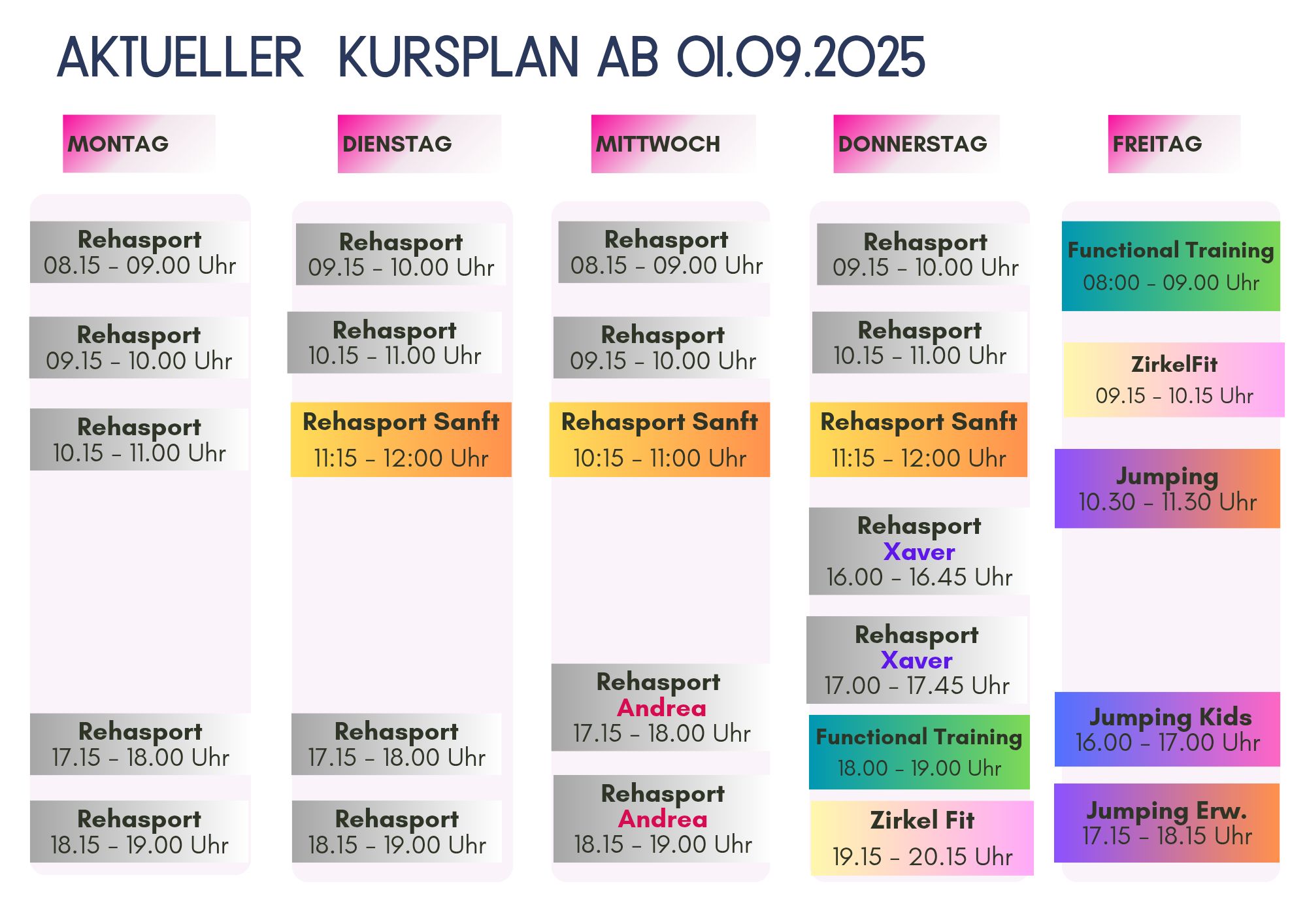 - Die Dauer einer Einheit beträgt im Rehasport ca. 45 Minuten im Präventionskurs ca. 60 Minuten mit max. 15 Teilnehmer*innen.